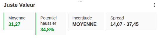 Selon InvestingPro, la valeur intrinsèque tourne autour de 31,3 euros pour un cours d’environ 23,5 euros. Cela représente un potentiel de hausse proche de 33 %, ce qui en fait la plus sous-évaluée de ces trois boîtes.