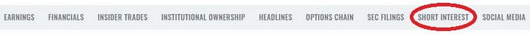 Ici aussi, commencez par taper le nom de l'action dans la barre de recherche, et cliquez sur le bouton Find Now. Cliquez ensuite sur l'onglet Short Interest, entouré en rouge ci-dessous :