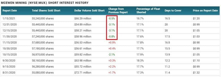 Là, vous trouverez des données très intéressantes sur le pourcentage de ventes à découvert, comme le volume d'actions shortées actuellement comparé au volume shorté le mois passé, et l'évolution de ce taux, positive ou négative. Dans l'exemple de McEwen Mining ci-dessous, on peut voir que le 15 janvier 2021, il y avait 0,47% d'actions shortées en moins par rapport au 31 décembre 2020. Il s'agit donc d'une évolution positive pour la mine d'or et d'argent.