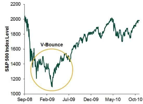 Restons en 2009 pour l'exemple. A l'époque, la reprise a pris la forme d'un V. Le problème c'est qu'on ne peut jamais savoir à l'avance quand la reprise débutera ni si elle aura la forme d'un V, d'un U ou même d'une racine carrée inversée.