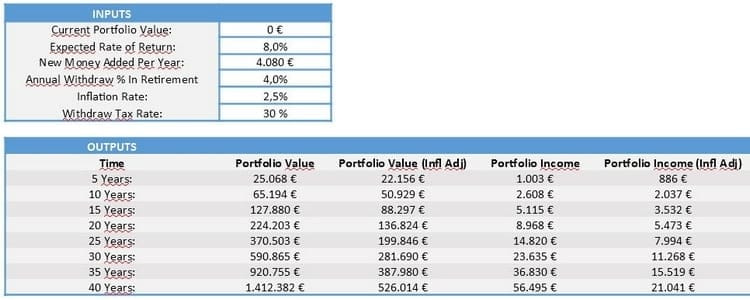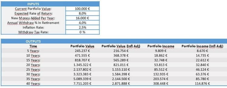Vous aurez en effet collecté environ 471.000€ au terme de cette période, ce qui vous permettra de dépenser 1.570€ de dividendes tous les mois sans entamer votre capital.
