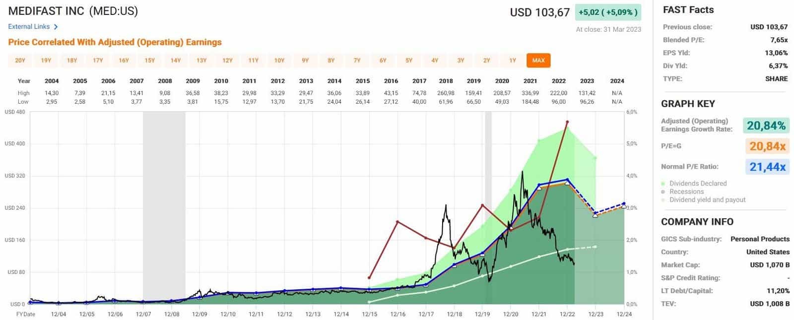 Medifast ($MED) est une société que j'ai découverte via le screener de la Formule Magique de Joel Greenblatt. Elle vend des produits de régime via plusieurs canaux : site Internet, télémarketing et cliniques spécialisées en perte de poids.