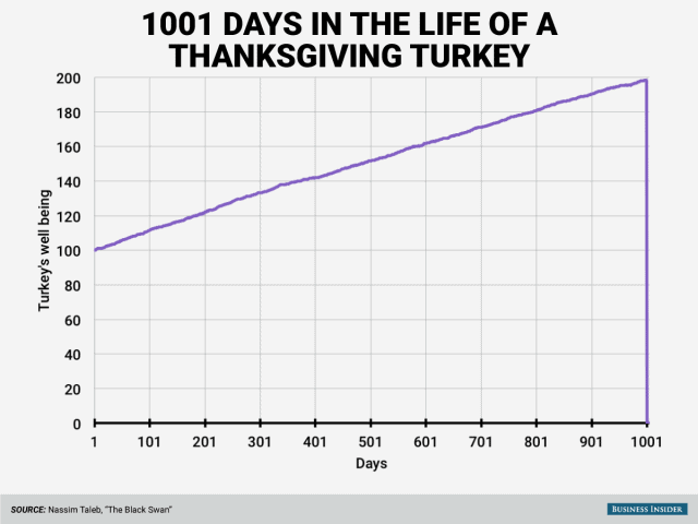 Une dinde est nourrie mille jours durant par un boucher ; chaque jour qui passe confirme à l’équipe d’analystes de la dinde que les bouchers adorent les dindes « avec un niveau de confiance de plus en plus élevé ».