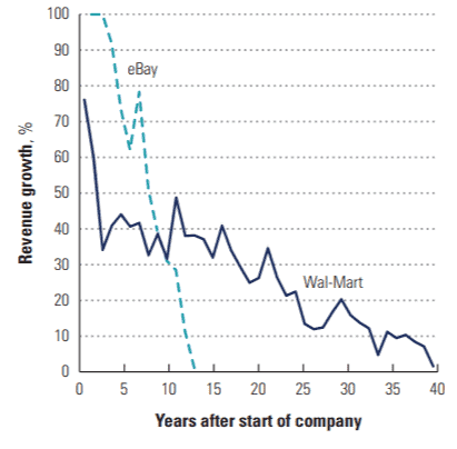 En effet, comme l’expliquent les auteurs du livre Valuation, 26% des entreprises de grande croissance parviennent à maintenir une croissance d’au moins 15%. Dans ces 26% on pourrait donc citer Google, Facebook, etc. Cependant 74% n’arriveront pas à tenir cette croissance.