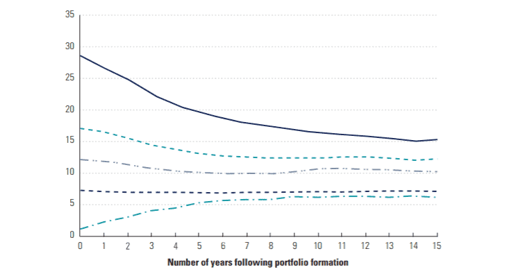 Voici le return on invested capital (ROIC) des entreprises non-financières après 15 années. On voit bien ici que les courbes ont tendances à se resserrer vers la moyenne.