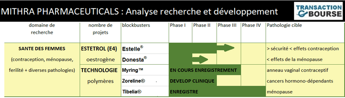 Il faut ajouter à cela de nombreuses études relatives à la technologie des polymères (macromolécules constituées d’une chaîne de molécules reliées), pour laquelle Mithra a prouvé son savoir-faire. Trois produits de ce type sont présents dans le pipeline de Mithra :