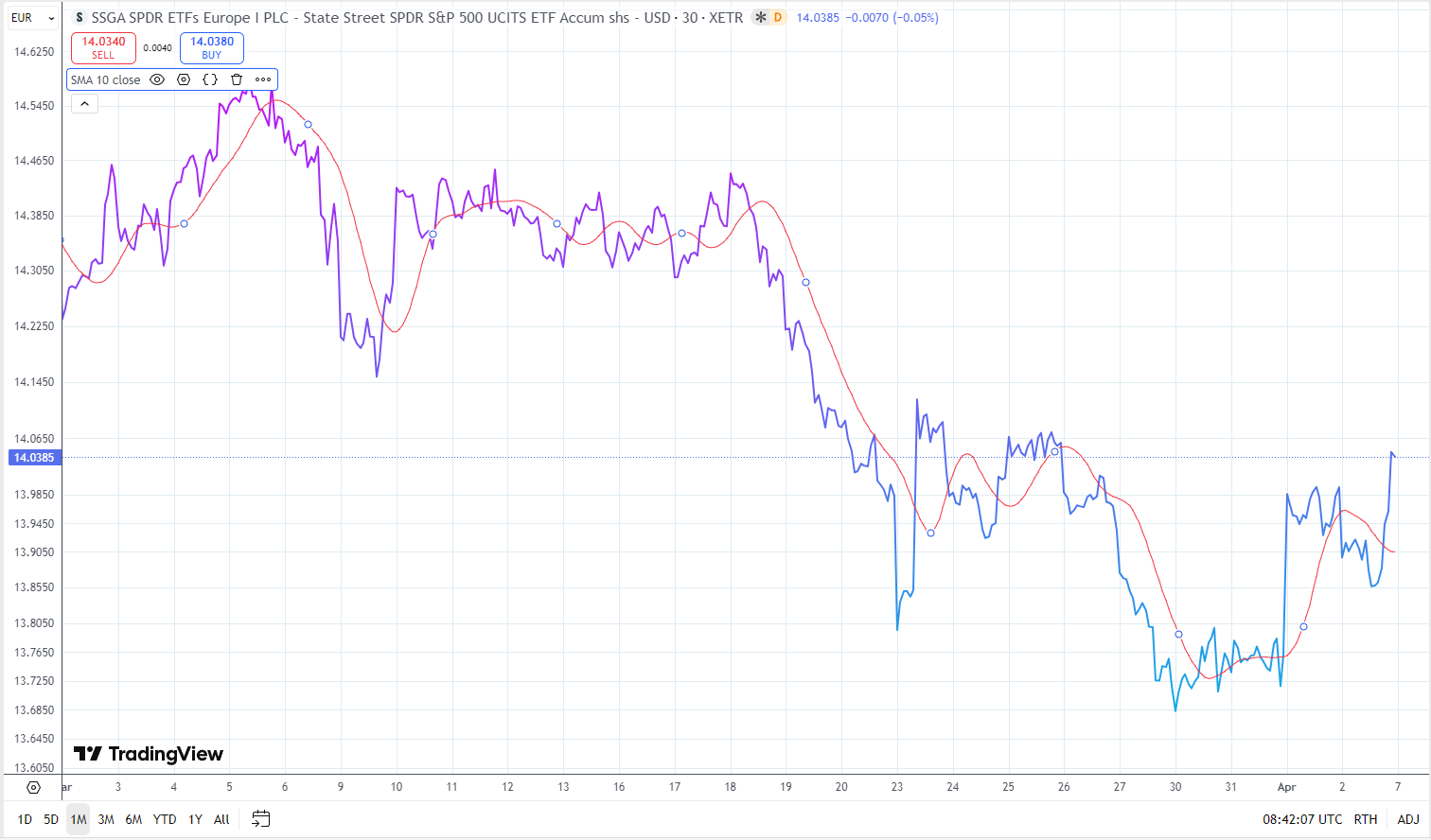 Imaginez que vous suivez un ETF Monde. Disons que vous l’achetez petit à petit, en mode DCA mais que vous voudriez une méthode un peu plus fine. Simple : premièrement, il vous suffit d'aller sur un site qui propose gratuitement l'affichage des moyennes mobiles, comme Yahoo Finance ou Tradingview. Partons sur Tradingview, car je trouve que les graphiques y sont très clairs. Commencez par y créer un compte gratuit, ça ne prend que 2 minutes maximum.