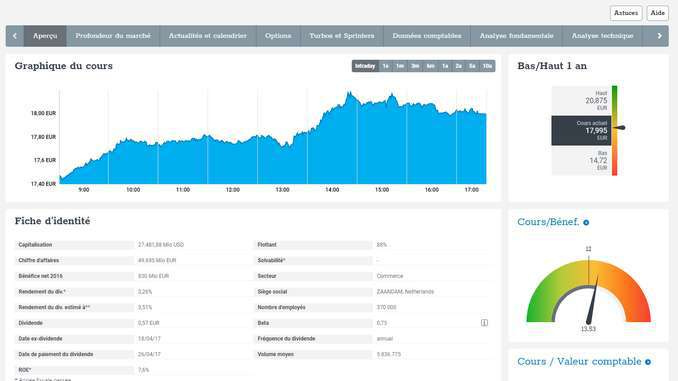 La navigation dans les menus est assez intuitive et les fiches de descriptif des actions, trackers ou autre sont très complètes. J'ai été très agréablement surpris par celles-ci. On y retrouve énormément d'informations. Sur celles-ci, vous avez accès à toutes les données comptables des sociétés mais aussi à l'analyse fondamentale ainsi qu'à l'analyse technique.