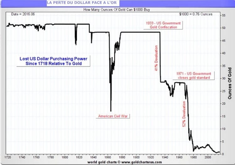 Comme le montre le graphique ci-dessous, le dollar, depuis le milieu du siècle précédent et les accords de Bretton-woods, a perdu plus de 90% de sa valeur par rapport à l’or. Cela donne une idée de ce que l’or pourrait déclencher si, un jour, l’argent perd de sa crédibilité.
